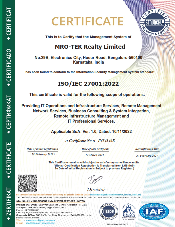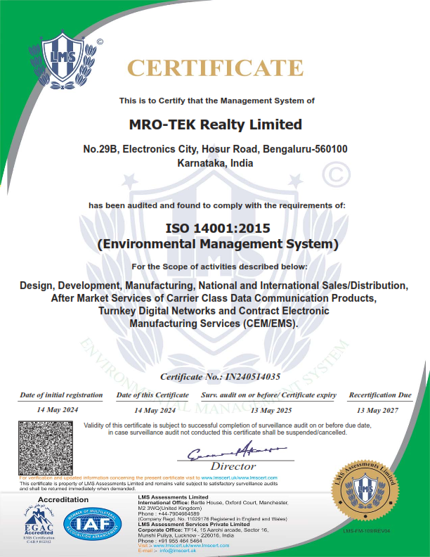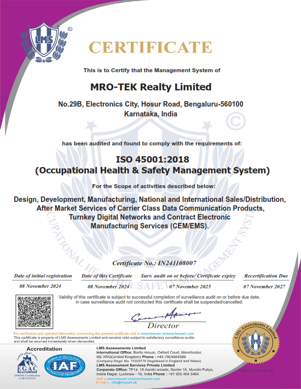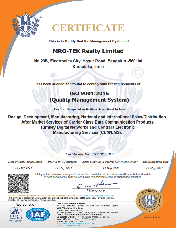 With four decades of Research and Development accumulation, and its wide acceptance in Indian market, MROTEK is able to provide industry-leading customization to products and tailor-made solutions that meet specific customer requirements. Headquartered in Bangalore - the Silicon Valley of India, our environment friendly factory campus is spread over 72,000 square feet. We deploy 3rd generation SMT processes and precise quality control for manufacturing an array of products complaint with international standards. We have branch offices at Mumbai, New Delhi and Kolkata and service network across India and neighbouring countries.
