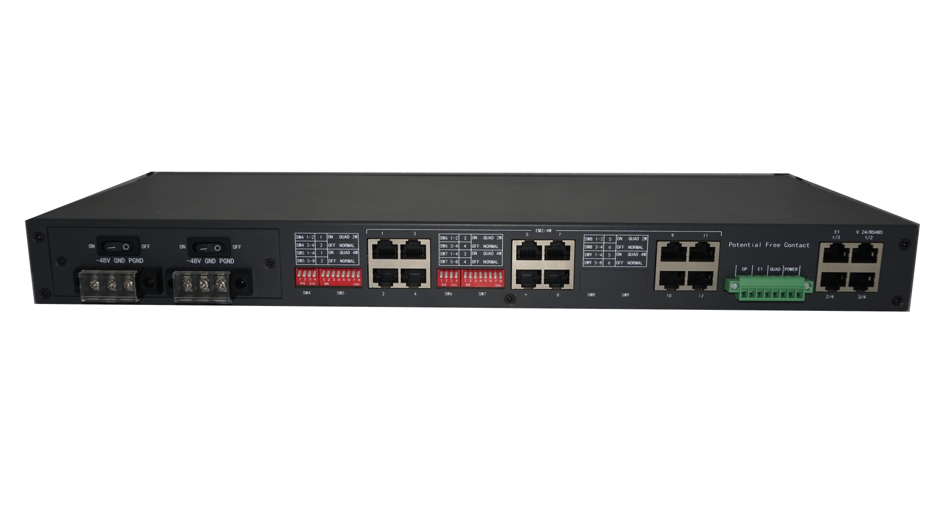 MAPLE-4C is a PCM multiplexer which achieves basically transferring FXS, FXO, V.24, RS485, EM2/4W and audio2/4W through E1 uplink paths supporting E1 uplink paths 1+1 protection and QUAD path protection is optional.